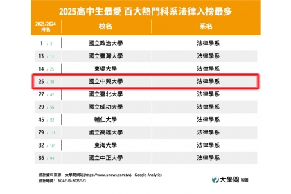 Among the top 100 most popular majors, Law was the most frequently listed discipline, with 10 programs making the ranking. NCHU’s department of Law was ranked fourth in the legal studies category. In recent years, the program has introduced various practical and interdisciplinary courses, such as the "Judicial Practice" course in collaboration with the Taichung District Court, the "Administrative Law Practice Learning" course with the Taichung City Government Legal Affairs Bureau, the "Criminal Law Practice" course with the Legal Aid Foundation, and the "Legal Professional Services and Learning" course in partnership with the Taichung Bar Association. These courses integrate theoretical knowledge with practical application, combining public service and professional training to provide students with comprehensive legal education and hands-on experience.