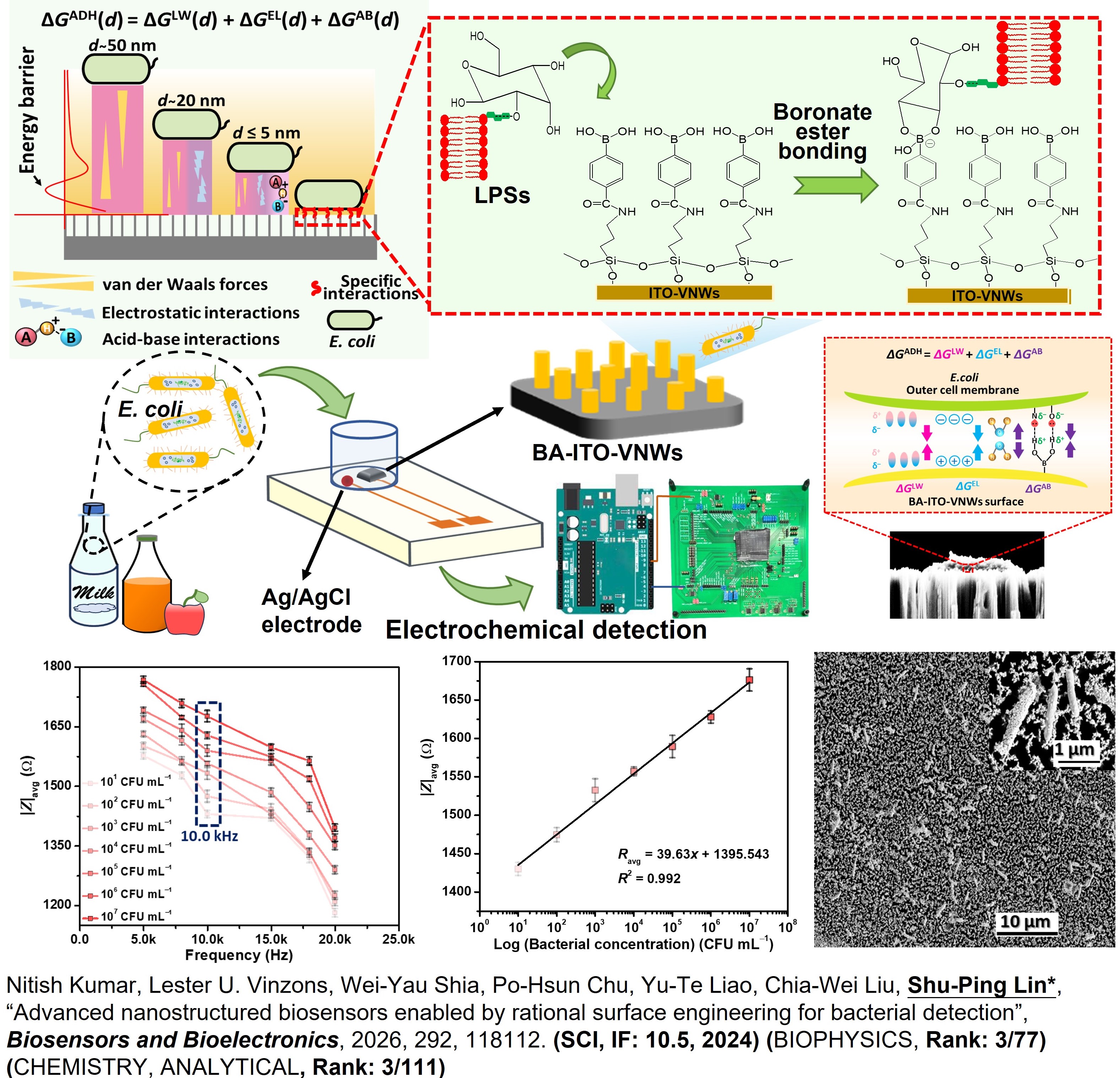 Bacterial contamination poses a persistent challenge to public health, food safety, and environmental monitoring. A research team led by Prof. Shu-Ping Lin from the Graduate Institute of Biomedical Engineering, National Chung Hsing University (NCHU), has developed a nanobrush-structured microbial biosensor capable of rapid and highly sensitive identification of Gram-specific bacteria. The study has been published in the top 3% international journal Biosensors and Bioelectronics (2024 IF: 10.5; CHEMISTRY, ANALYTICAL: Rank 3/111; BIOPHYSICS: Rank 3/77).