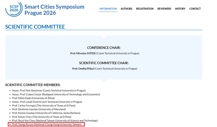Professor Lee, Tzong-Ru of National Chung Hsing University Invited to Serve as Scientific Committee Member of the Smart Cities Symposium Prague (SCSP 2026), Advancing Asia–Europe Collaboration in Smart City Development