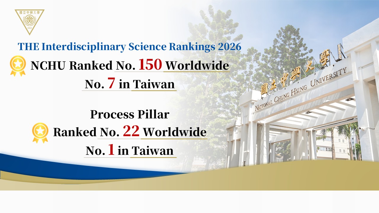 Times Higher Education (THE) announced the results of the 2026 Interdisciplinary Science Rankings (ISR) on November 20. In its debut participation, National Chung Hsing University (NCHU) achieved an impressive Global Rank of 150 and 7th in Taiwan, demonstrating outstanding interdisciplinary research strength. Notably, NCHU excelled in the Process pillar—representing institutional maturity, research governance, and support systems—ranking 22nd globally, within the top 2.4% worldwide, and No. 1 in Taiwan, underscoring its world-class capacity in interdisciplinary research governance and institutional design.