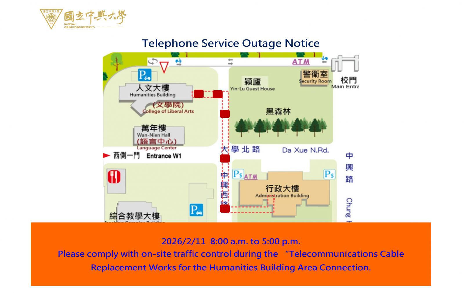 | Explanation | Internal telephone services of the Humanities Building, Yin-Lu Guest House, and the Campus Security Office will be affected during the telecommunications cable replacement works connecting the Humanities Building area (dedicated lines will not be affected). For urgent official contact, please use external (dedicated) lines. We apologize for any inconvenience caused. |