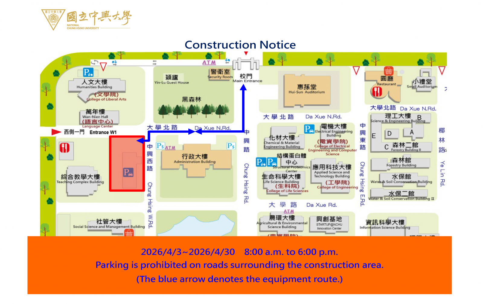 | Explanation | All faculty, students, and visitors are requested to follow on-site notices, avoid parking in the construction area, nearby parking lots, and sidewalks, and comply with traffic control. Noise may occur during construction; your understanding is appreciated. Work will be rescheduled in case of typhoon or heavy rain. |