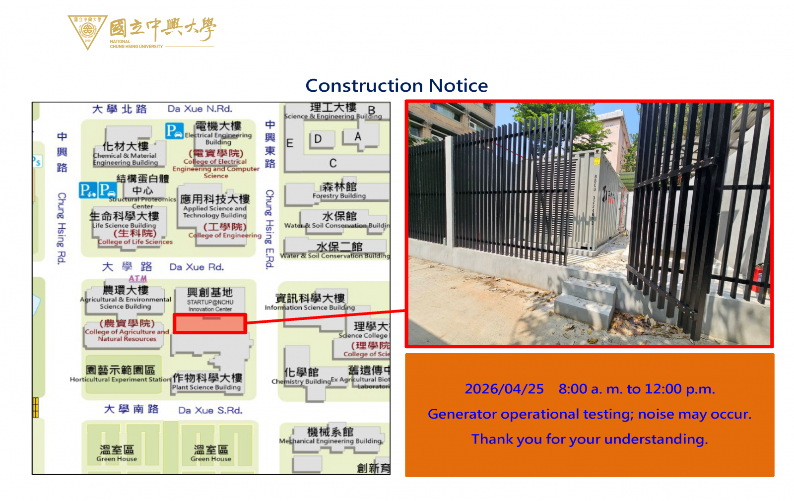 | Explanation | A generator operational test will be conducted. Faculty, staff, students, and visitors are kindly requested to follow on-site instructions. Some noise may occur during the testing period due to related work activities; your understanding is appreciated. In the event of force majeure (e.g., typhoons or heavy rain), the schedule will be postponed accordingly. |