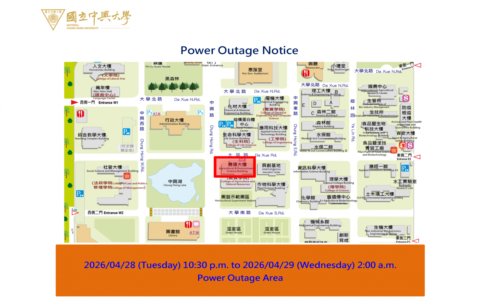 | Explanation | During the equipment operation testing for the University’s Integrated Microgrid Construction Project, a full power outage will be implemented at the Agricultural and Environmental Sciences Building. If the planned outage cannot be carried out due to weather conditions (such as rainy days) or other factors, the outage schedule will be announced separately. We apologize for any inconvenience caused. |
