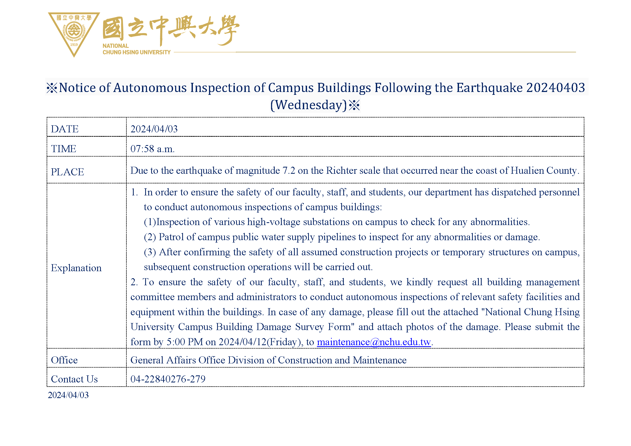 (2) Patrol of campus public water supply pipelines to inspect for any abnormalities or damage. (3) After confirming the safety of all assumed construction projects or temporary structures on campus, subsequent construction operations will be carried out. 2. To ensure the safety of our faculty, staff, and students, we kindly request all building management committee members and administrators to conduct autonomous inspections of relevant safety facilities and equipment within the buildings. In case of any damage, please fill out the attached "National Chung Hsing University Campus Building Damage Survey Form" and attach photos of the damage. Please submit the form by 5:00 PM on 2024/04/12(Friday), to maintenance@nchu.edu.tw. |