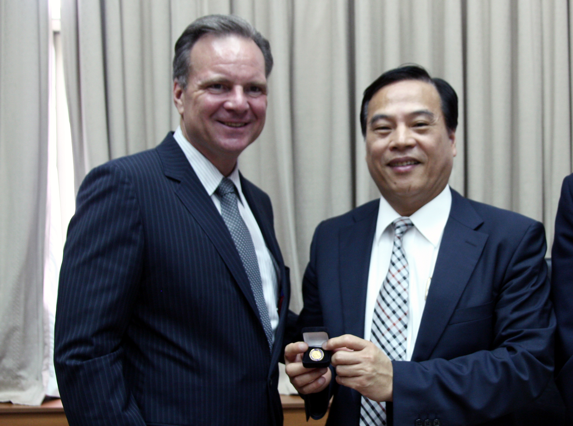 聖郡議長柯戴維與興大校長蕭介夫(右)互贈紀念品
