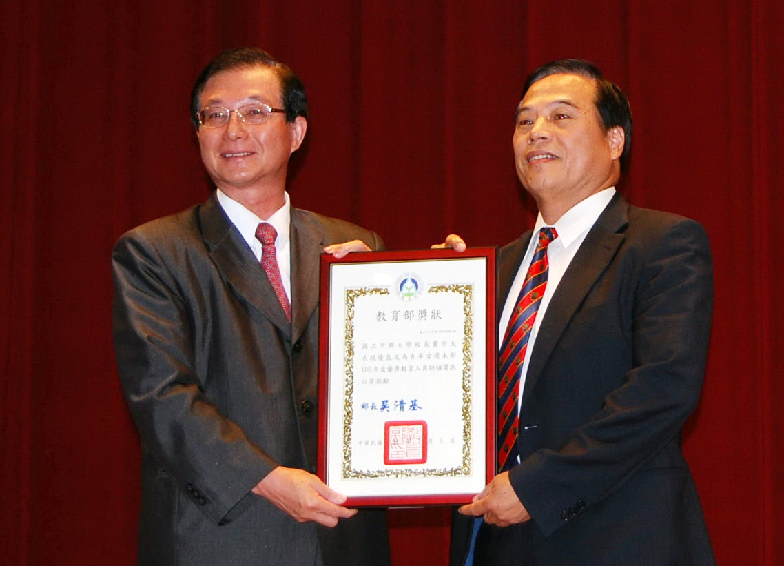 ![]() 教育部長吳清基頒發「優秀公教人員獎」予蕭介夫校長 |