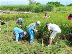 昨參與割稻體驗的學生有大學生及國中小學童,由於天氣炎熱,大家一下田就汗流浹背,卻還開心地互相PK,看誰割稻的手腳比較快。許多家長見狀也下場幫忙,但才一會兒功夫,大家就喊累。