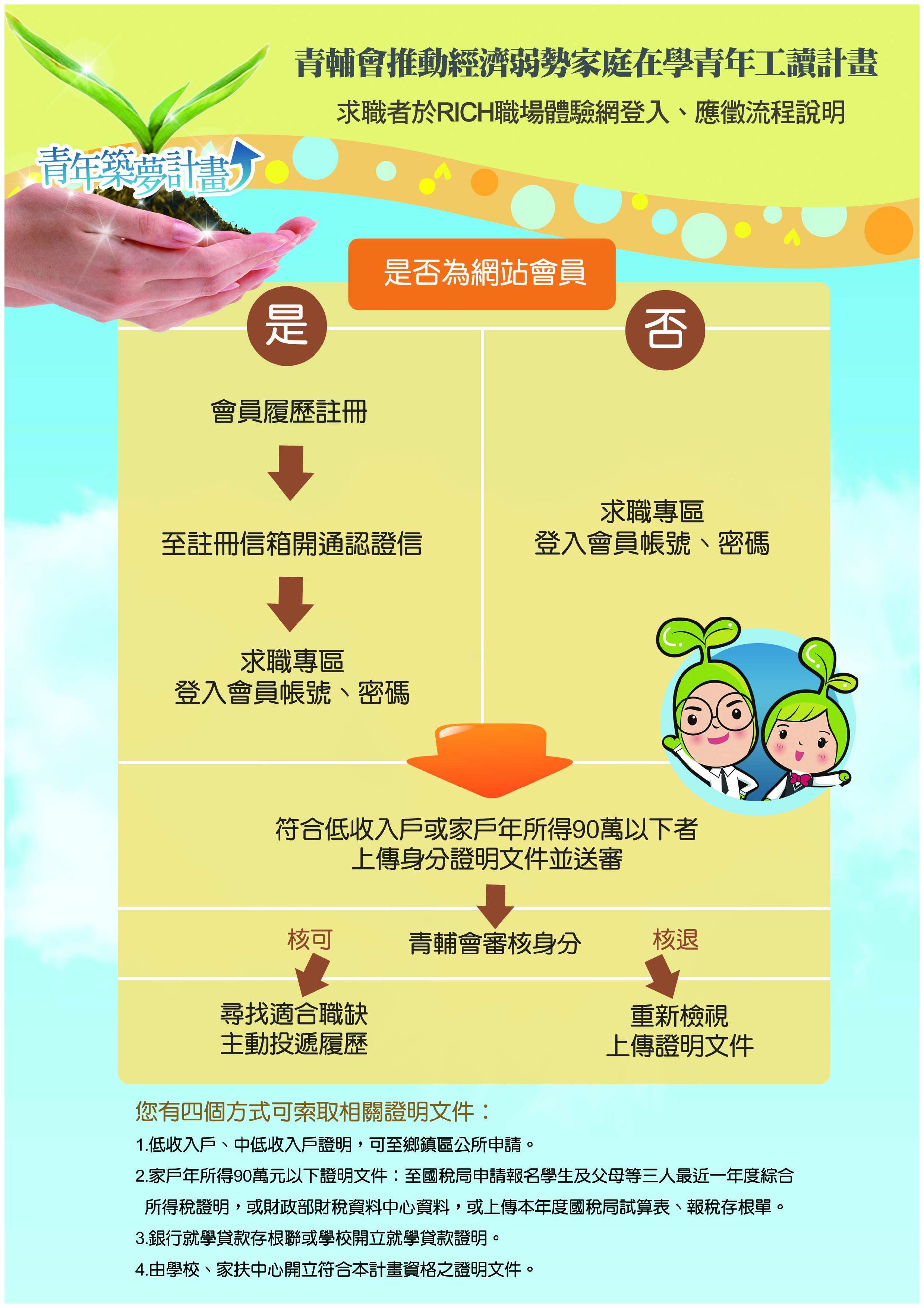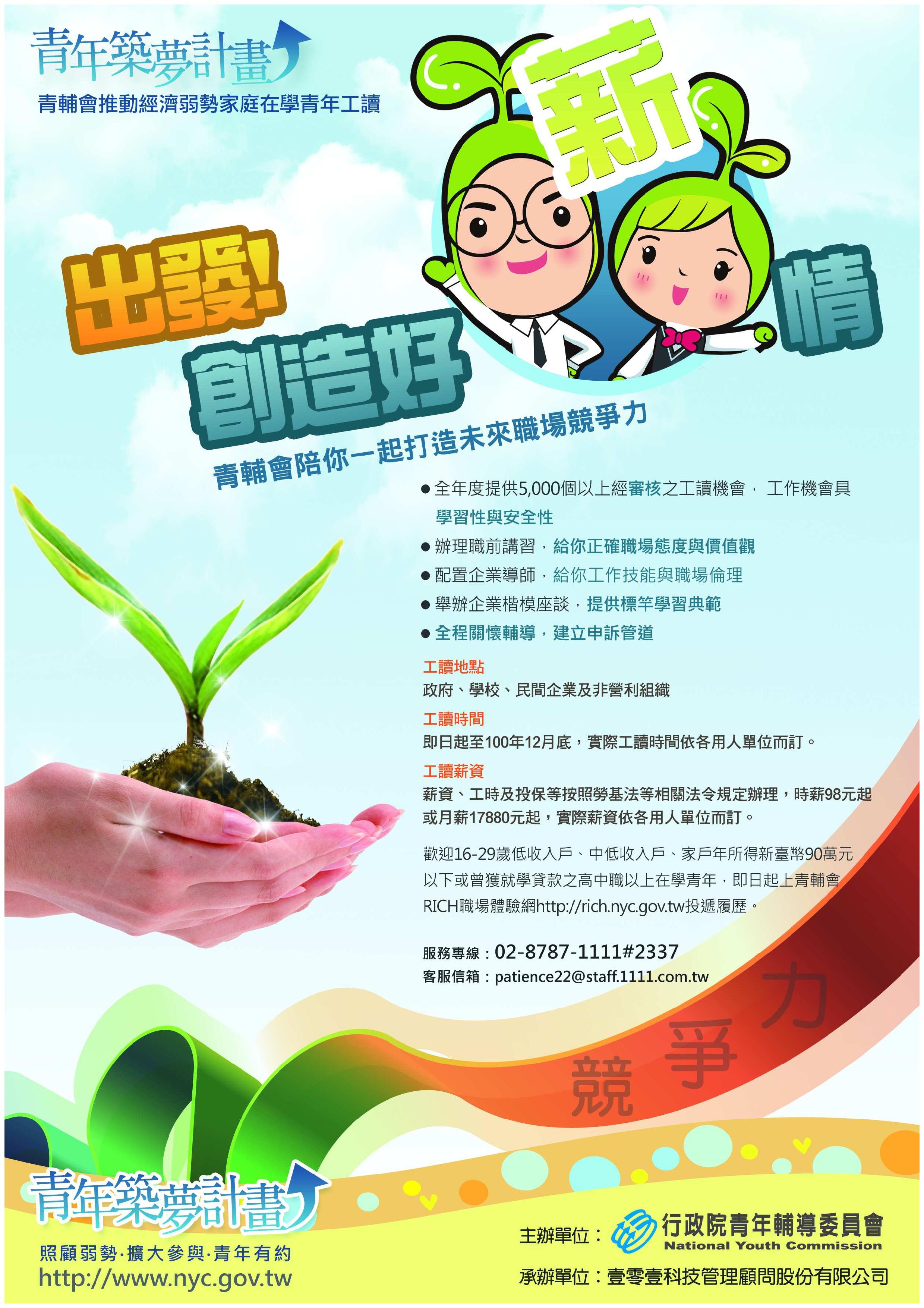 青輔會「推動經濟弱勢家庭在學青年工讀計畫」放寬青年報名資格,詳情請至RICH職場體驗網瀏覽。http://rich.nyc.gov.tw/richCandidate/