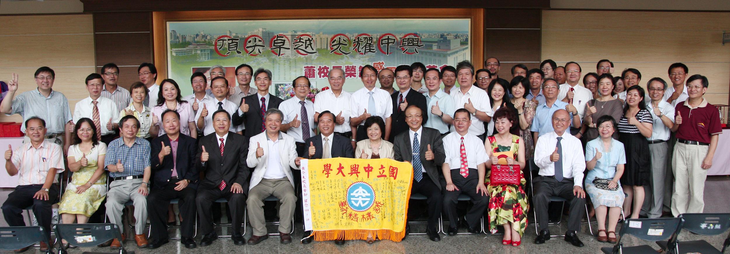 由興大媒體公關組主辦的卸任校長歡送會,邀請到校友會理事長柯興樹、傑出校友林萬年、中市副市長蕭家淇、明道大學更長陳世雄等各界貴賓與會,100多位校內主管、師生、教職員與校友齊聚行政大樓1樓穿堂,共同歡送領導興大7年的蕭介夫校長。