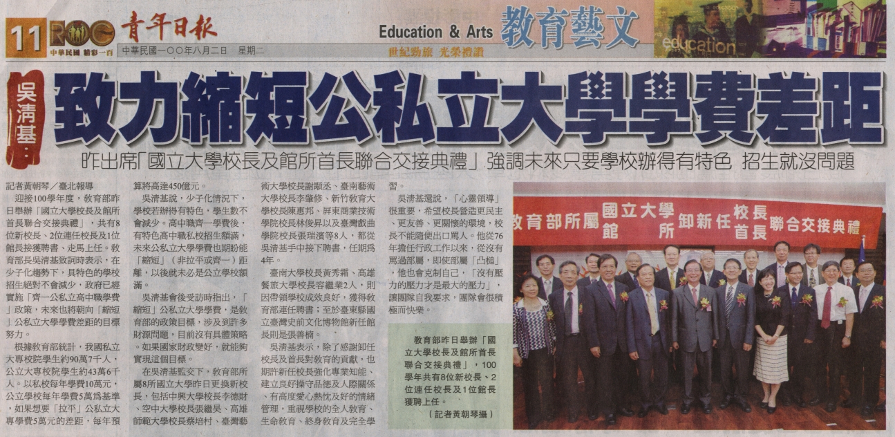 迎接100學年度,教育部昨日舉辦「國立大學校長及館所首長聯合交接典禮」,共有8位新校長、2位連任校長及1位館長接獲聘書、走馬上任。教育部長吳清基致詞時表示,在少子化趨勢下,具特色的學校招生絕對不會減少,政府已經實施「齊一公私立高中職學費」政策,未來也將朝向「縮短」公私立大學學費差距的目標努力。