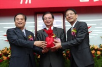 教育部長吳清基(中)監交,興大新任校長李德財(右)從卸任校長蕭介夫手中接下印信。興大/提供 |