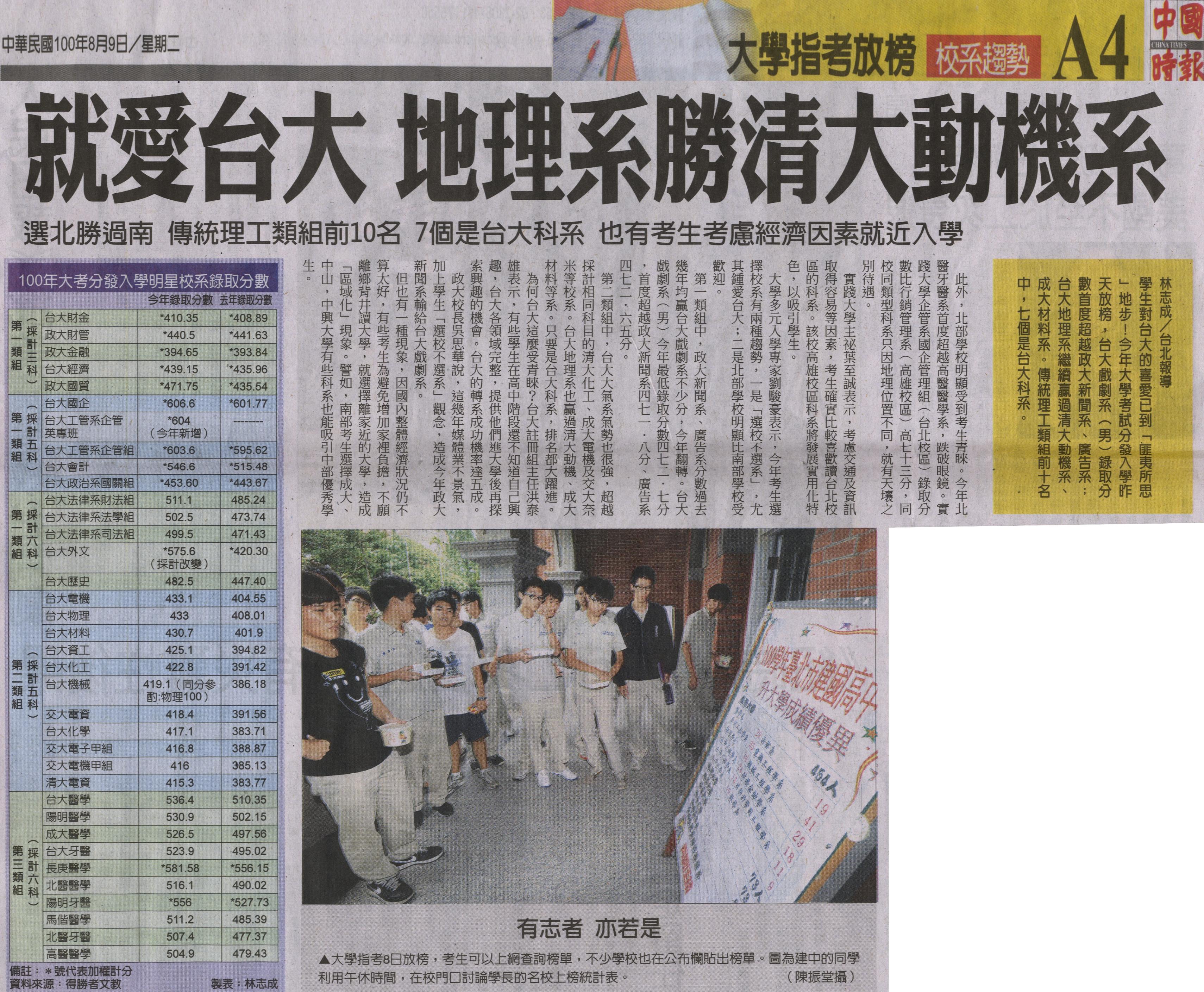 學生對台大的喜愛已到「匪夷所思」地步!今年大學考試分發入學昨天放榜,台大戲劇系(男)錄取分數首度超越政大新聞系、廣告系;台大地理系繼續贏過清大動機系、成大材料系。傳統理工類組前十名中,七個是台大科系。