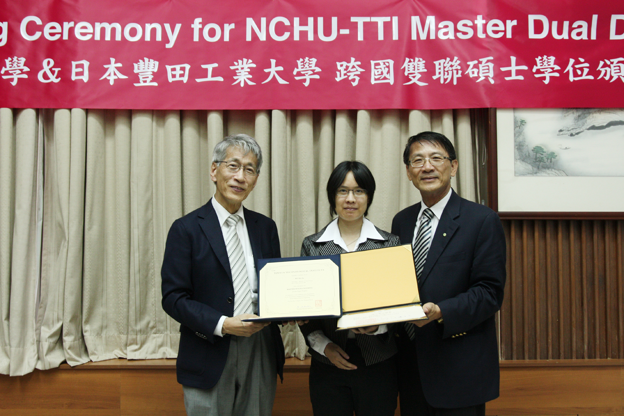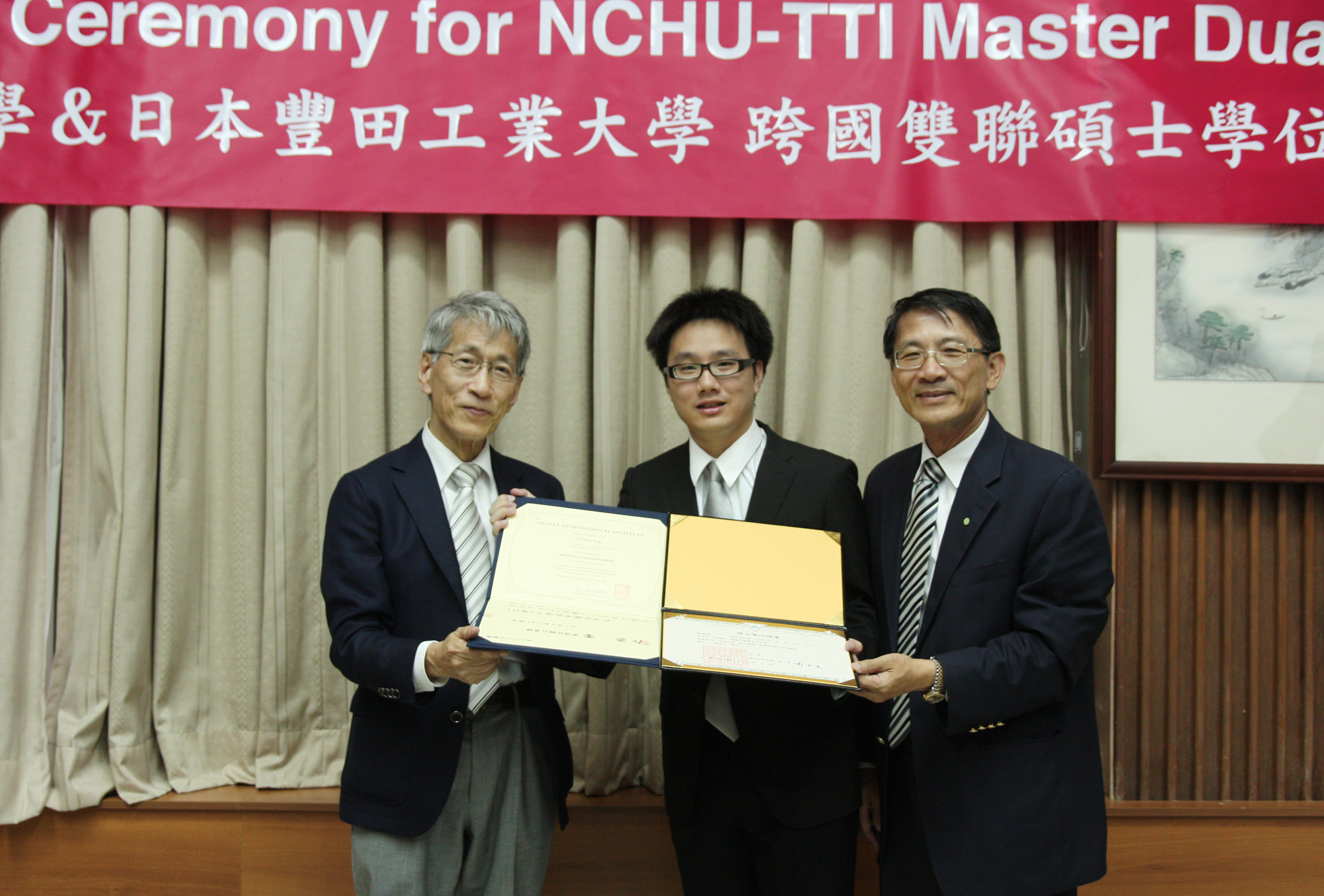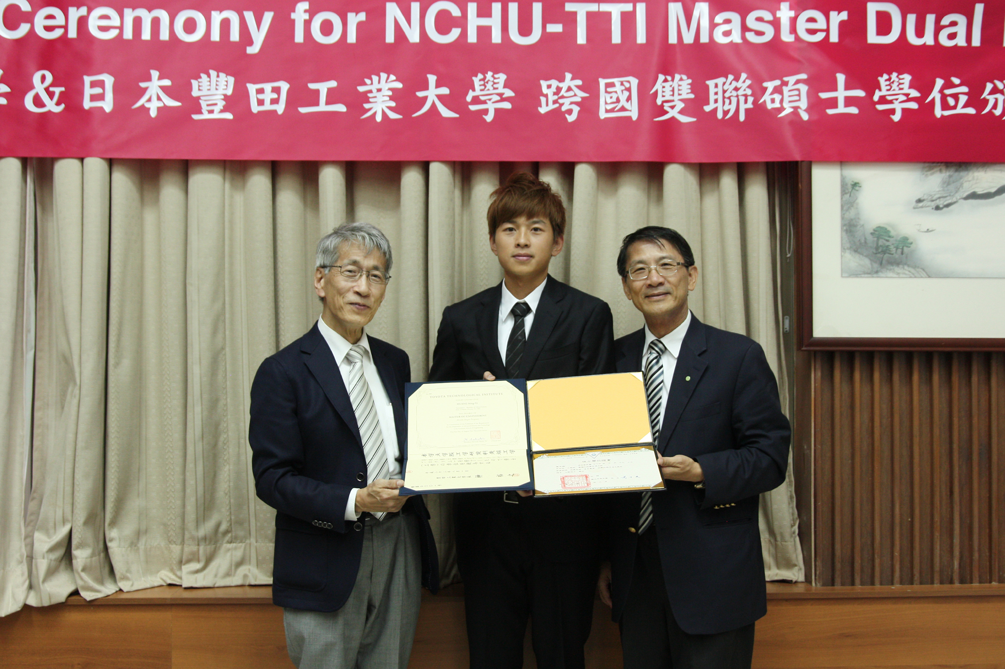 中興大學與日本豐田工業大學8日舉辦「跨國雙聯碩士學位頒發典禮」,興大電機所黃名毅、李乾鼎與裴希佳3位研究生是校內首批獲頒台、日兩校雙碩士學位的學生,由興大校長李德財與豐田工業大學校長榊裕之(Hiroyuki Sakaki)共同授證。