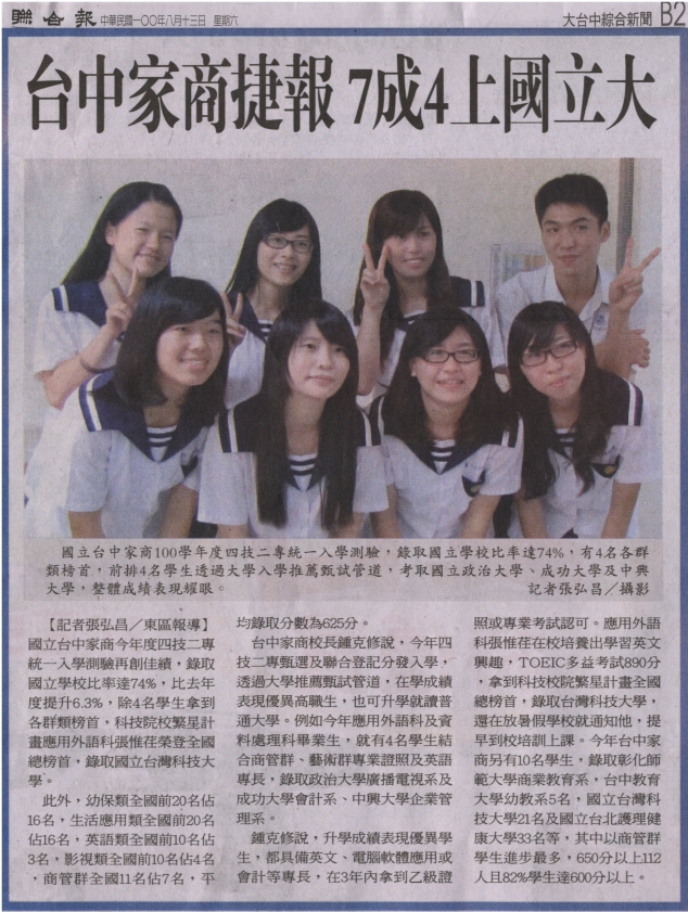 台中家商校長鍾克修說,今年四技二專甄選及聯合登記分發入學,透過大學推薦甄試管道,在學成績表現優異高職生,也可升學就讀普通大學。例如今年應用外語科及資料處理科畢業生,就有4名學生結合商管群、藝術群專業證照及英語專長,錄取政治大學廣播電視系及成功大學會計系、中興大學企業管理系。