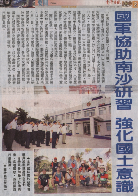 國防部指出,中山大學為推動全民國防教育,增進青年學子對國防事務之認識,規劃於暑假期間辦理南海學術研究。研習活動是以海洋科技、人文歷史、生態保育為研習主軸,並能見證海軍及海巡弟兄戍守海疆辛勞,體驗南沙環礁生態與海洋資源之重要性,進而深耕國土疆域意識,激發青年學子愛國熱情,擴大全民國防教育功能。