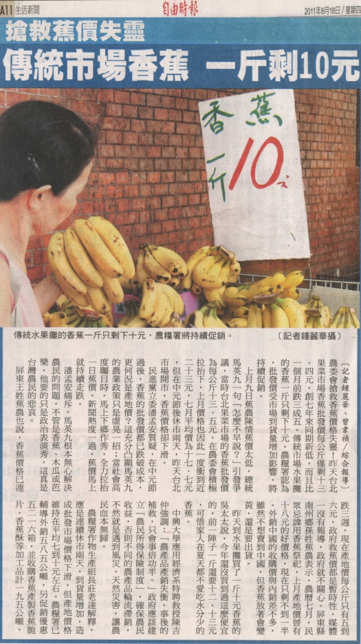 昨天到水果攤買了一斤十元香蕉的吳太太說,今年還沒買過這麼便宜的,前一陣子還要十二、十三元,可惜家人在夏天都不愛吃水分少的香蕉。