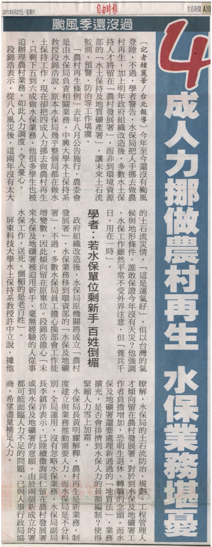 4成人力挪做農村再生 水保業務堪憂