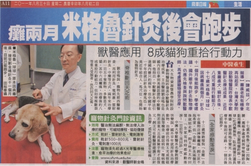 癱瘓老狗有機會再站起來。台灣大學附設動物醫院昨發表中獸醫針灸療法成果,近百隻癱瘓犬、貓針灸後,八成可重拾行動能力;十七歲米格魯「球球」因病癱瘓兩個月,針灸十一個月後能跑步。學者建議,國外雖早有針灸動物療法,仍應先檢查與詢問獸醫師,再考慮讓寵物接受治療。