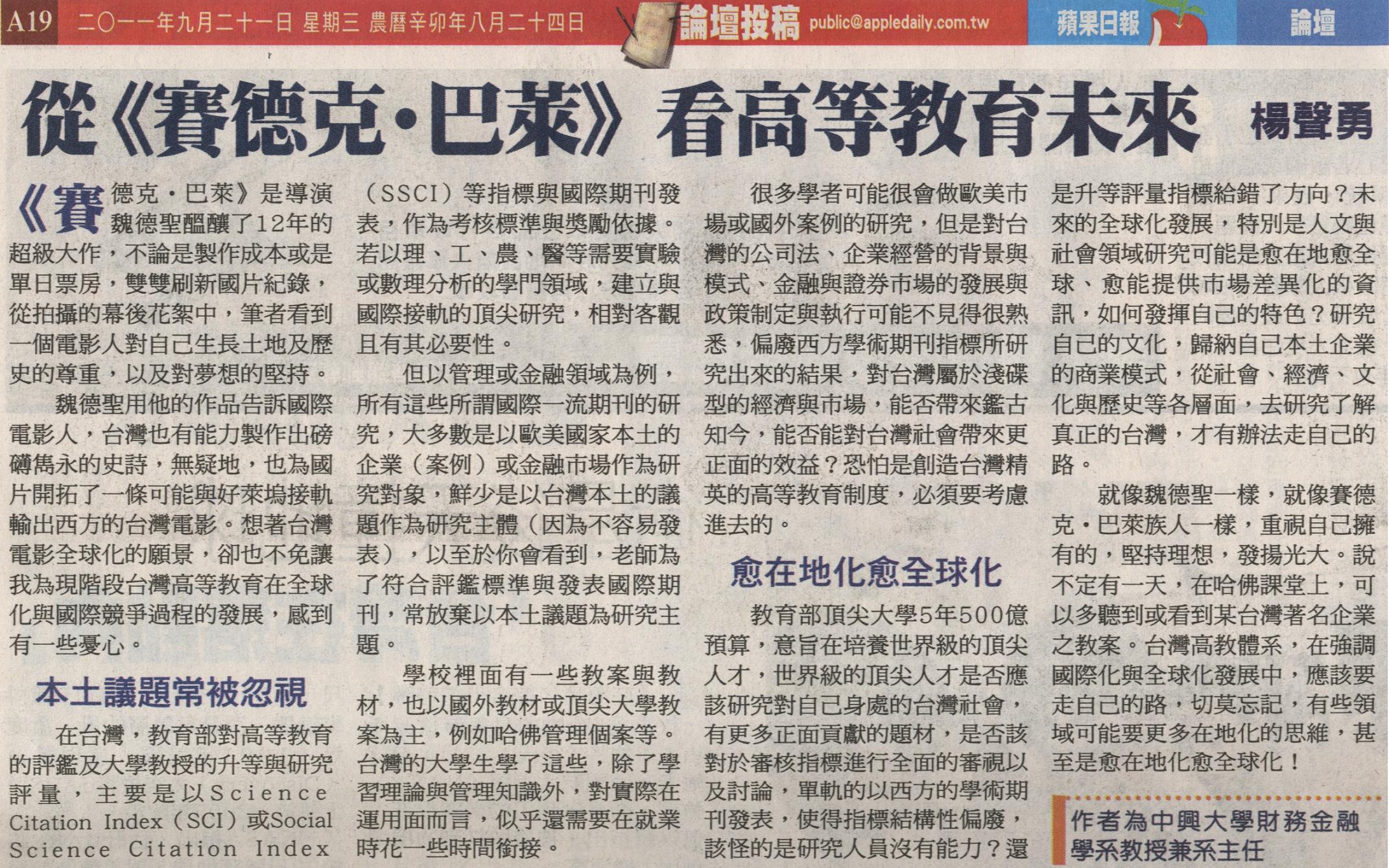 國《賽德克.巴萊》是導演魏德聖醞釀了12年的超級大作,不論是製作成本或是單日票房,雙雙刷新國片紀錄,從拍攝的幕後花絮中,筆者看到一個電影人對自己生長土地及歷史的尊重,以及對夢想的堅持。 魏德聖用他的作品告訴國際電影人,台灣也有能力製作出磅礡雋永的史詩,無疑地,也為國片開拓了一條可能與好萊塢接軌輸出西方的台灣電影。想著台灣電影全球化的願景,卻也不免讓我為現階段台灣高等教育在全球化與國際競爭過程的發展,感到有一些憂心。