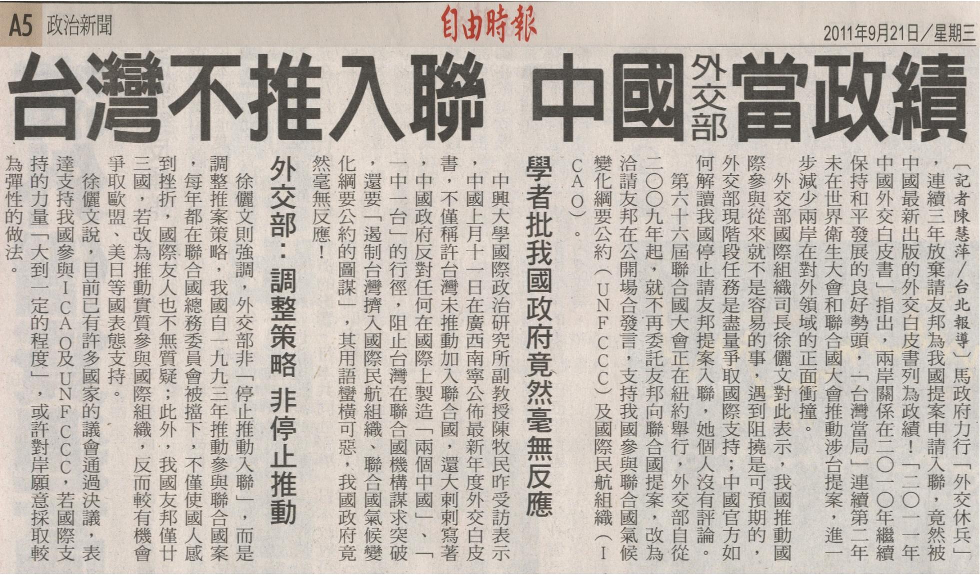 中興大學國際政治研究所副教授陳牧民昨受訪表示,中國上月十一日在廣西南寧公佈最新年度外交白皮書,不僅稱許台灣未推動加入聯合國,還大剌剌寫著,中國政府反對任何在國際上製造「兩個中國」、「一中一台」的行徑,阻止台灣在聯合國機構謀求突破,還要「遏制台灣擠入國際民航組織、聯合國氣候變化綱要公約的圖謀」,其用語蠻橫可惡,我國政府竟然毫無反應!