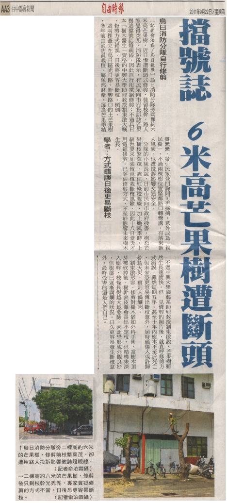 烏日消防分隊旁兩棵約六米高芒果樹,近日慘遭斷頭式修剪,徒留枝幹,路人頗覺得突兀,消防隊表示,有民眾向市府投訴該芒果樹遮擋號誌燈視線,因此自行用電鋸修剪;不過具日本「樹木醫生」資格的中興大學助理教授劉東啟大嘆,修剪方式錯誤,日後將更容易斷枝、傾倒。