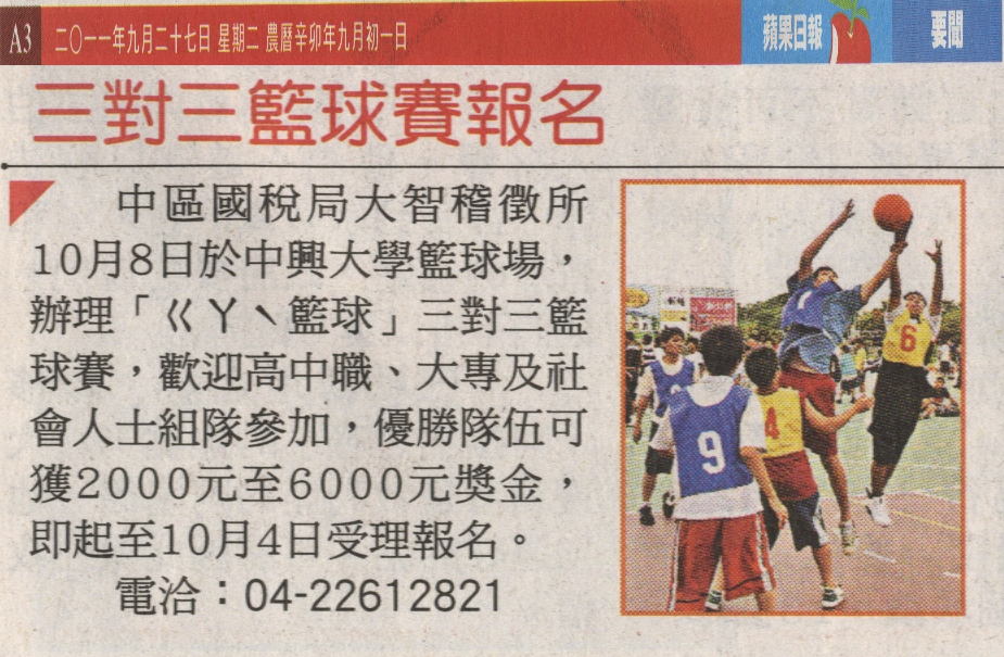 中區國稅局大智稽徵所10月8日於中興大學籃球場,辦理「ㄍㄚˋ籃球」三對三籃球賽,歡迎高中職、大專及社會人士組隊參加,優勝隊伍可獲2000元至6000元獎金,即起至10月4日受理報名。