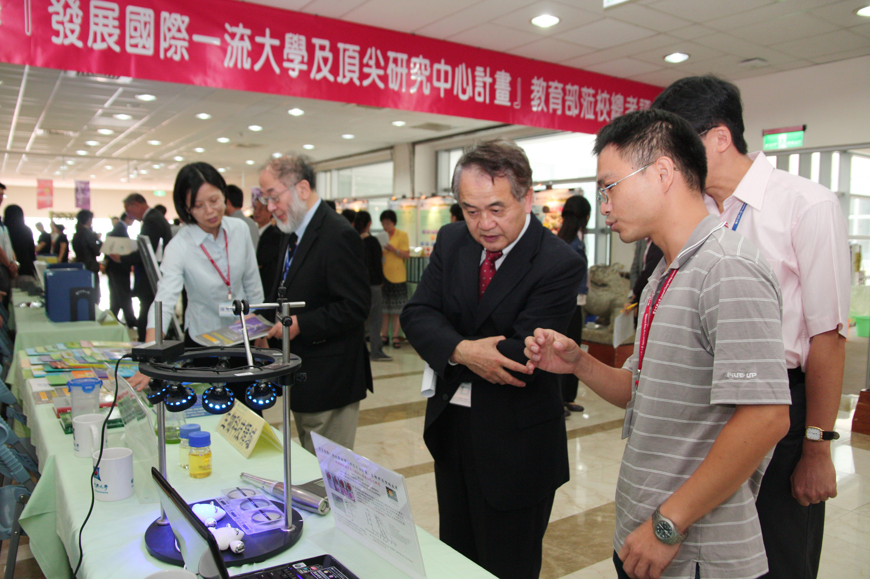 訪評小組實地訪視本校頂尖計畫執行成果,吳金洌委員與黃秉乾委員(左二)仔細聆聽本校同仁解說。 |