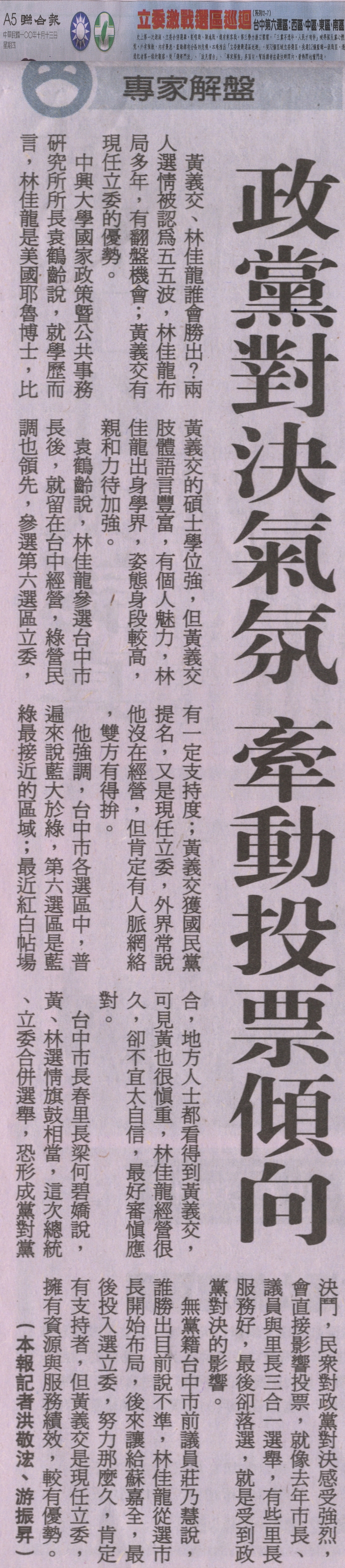 袁鶴齡說,林佳龍參選台中市長後,就留在台中經營,綠營民調也領先,參選第六選區立委,有一定支持度;黃義交獲國民黨提名,又是現任立委,外界常說他沒在經營,但肯定有人脈網絡,雙方有得拚。