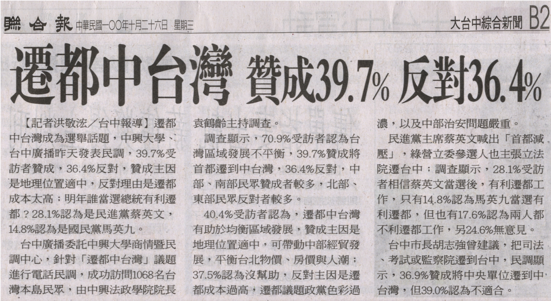 台中市長胡志強曾建議,把司法、考試或監察院遷到台中,民調顯示,36.9%贊成將中央單位遷到中台灣,但39.0%認為不適合。