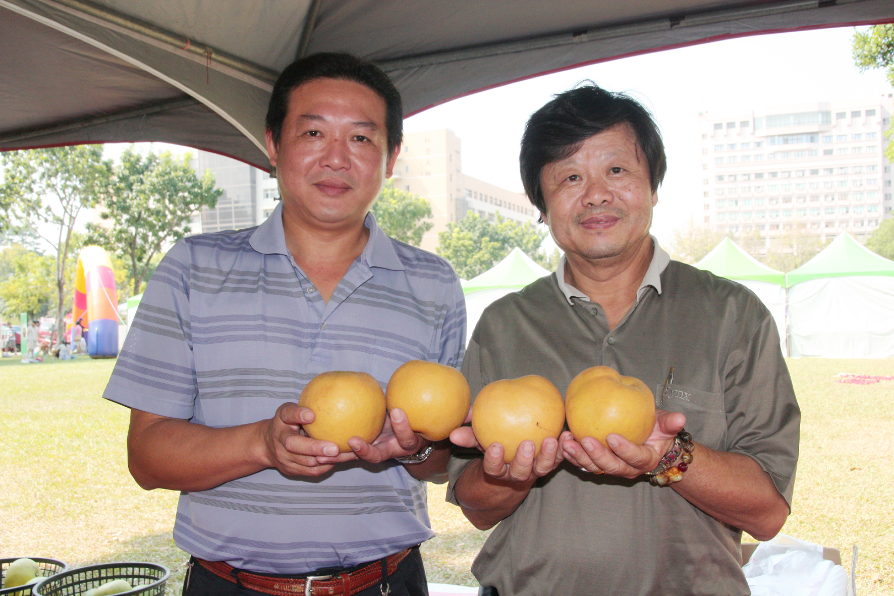- 相關附件 出產冠軍柿的農場一家人.jpg 、 興大植病系主任蔡東纂(右)與種出冠軍梨的怡大農場老闆曾肇廷合影.jpg