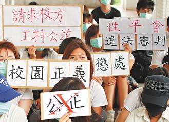師生戀常引發爭議,政大學生九月間在校園行政大樓門口靜坐,聲援因師生戀遭政大性平會處分的一名副教授。 本報資料照片/記者侯永全攝影 |