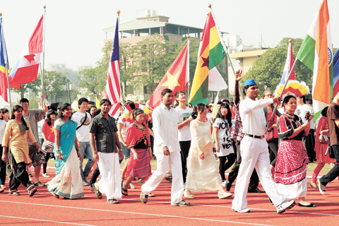 中興大學校慶運動會,外籍學生穿著自己國家特色服飾,並拿著各國大型國旗繞場,得到最多掌聲。 (圖:中興大學提供) |