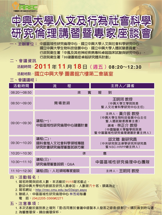 - 相關附件 1118興大人社研究倫理講習暨專家座談議程(1027).pdf 、 1118中興活動海報-1.JPG