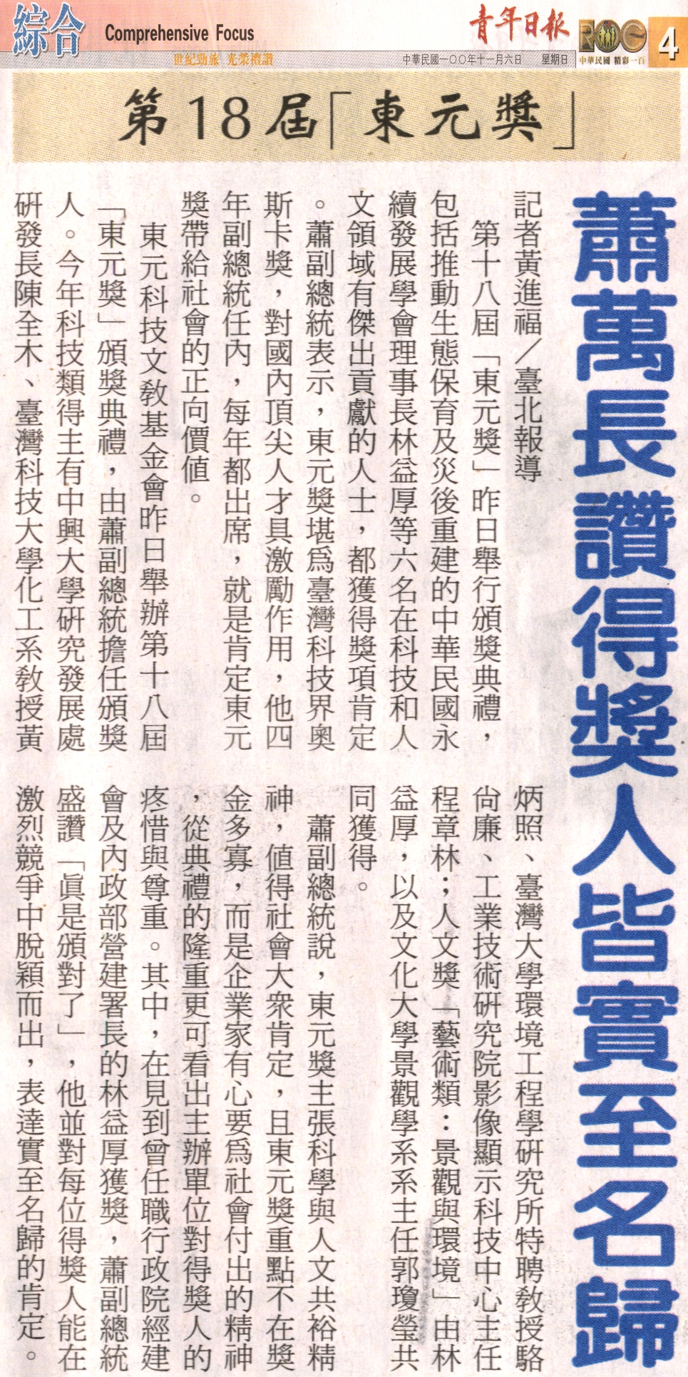 第十八屆「東元獎」昨日舉行頒獎典禮,包括推動生態保育及災後重建的中華民國永續發展學會理事長林益厚等六名在科技和人文領域有傑出貢獻的人士,都獲得獎項肯定。蕭副總統表示,東元獎堪為臺灣科技界奧斯卡獎,對國內頂尖人才具激勵作用,他四年副總統任內,每年都出席,就是肯定東元獎帶給社會的正向價值。東元科技文教基金會昨日舉辦第十八屆「東元獎」頒獎典禮,由蕭副總統擔任頒獎人。今年科技類得主有中興大學研究發展處研發長陳全木、臺灣科技大學化工系教授黃炳照、臺灣大學環境工程學研究所特聘教授駱尚廉、工業技術研究院影像顯示科技中心主任程章林;人文獎「藝術類:景觀與環境」由林益厚,以及文化大學景觀學系系主任郭瓊瑩共同獲得。 蕭副總統說,東元獎主張科學與人文共裕精神,值得社會大眾肯定,且東元獎重點不在獎金多寡,而是企業家有心要為社會付出的精神,從典禮的隆重更可看出主辦單位對得獎人的疼惜與尊重。其中,在見到曾任職行政院經建會及內政部營建署長的林益厚獲獎,蕭副總統盛讚「真是頒對了」,他並對每位得獎人能在激烈競爭中脫穎而出,表達實至名歸的肯定。