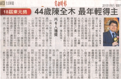 中興大學研發長陳全木未滿四十四歲,為東元獎十八年來最年輕的得主。他在金門戰地砲火聲中長大,一路努力求學,三十六歲升教授,目前為「特聘教授」。