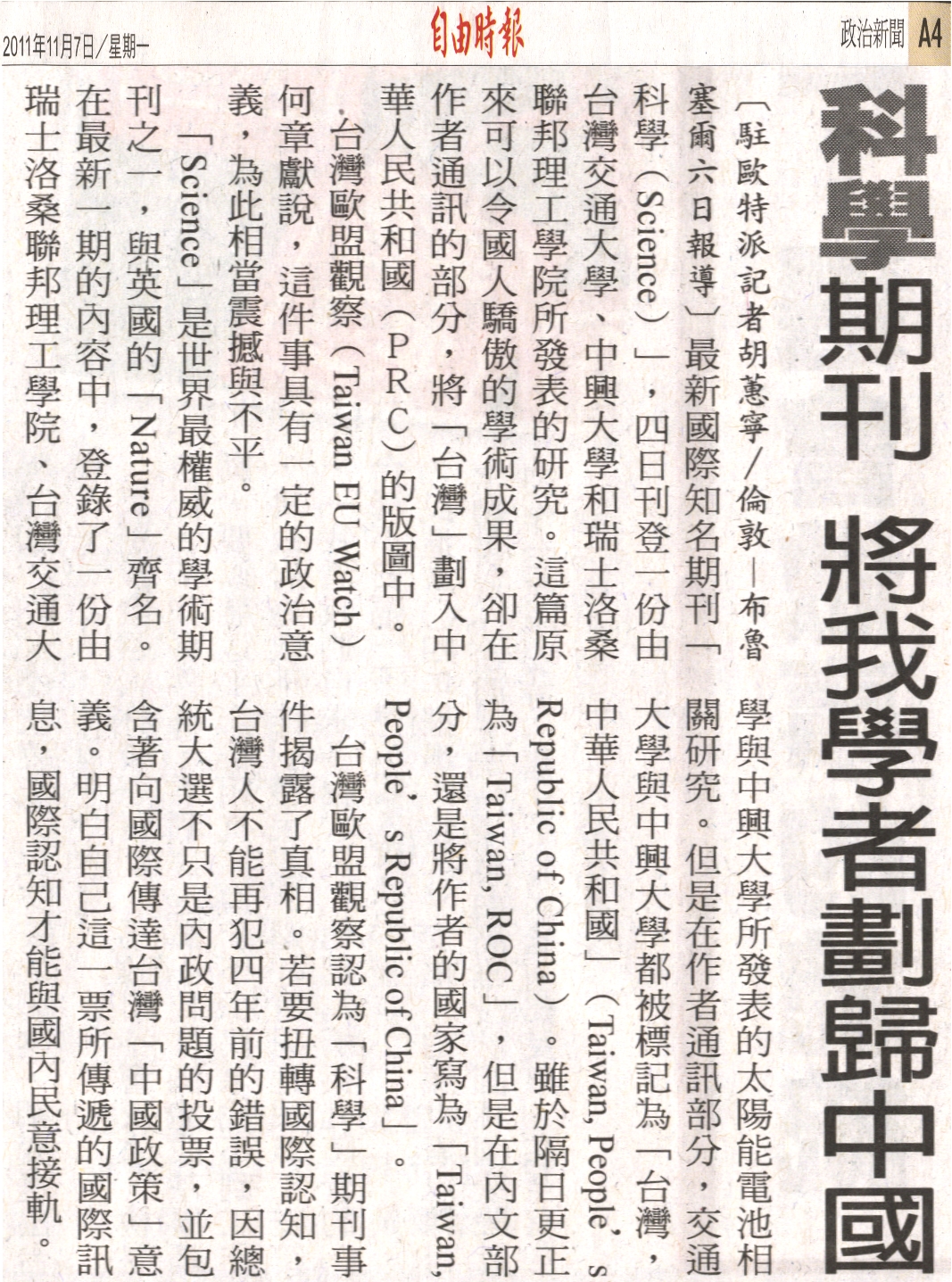 「Science」是世界最權威的學術期刊之一,與英國的「Nature」齊名。在最新一期的內容中,登錄了一份由瑞士洛桑聯邦理工學院、台灣交通大學與中興大學所發表的太陽能電池相關研究。但是在作者通訊部分,交通大學與中興大學都被標記為「台灣,中華人民共和國」(Taiwan, People’s Republic of China)。雖於隔日更正為「Taiwan, ROC」,但是在內文部分,還是將作者的國家寫為「Taiwan, People’s Republic of China」。