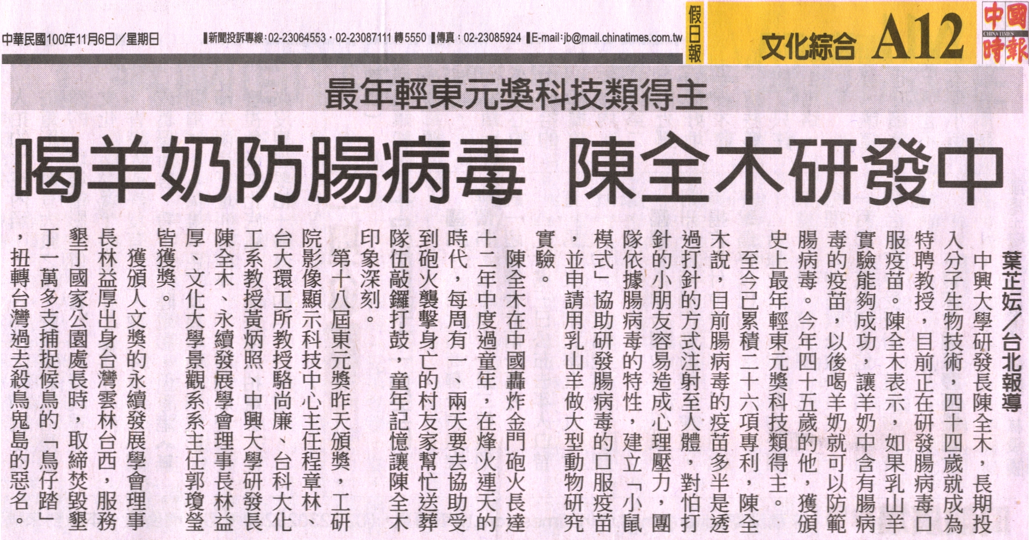 中興大學研發長陳全木,長期投入分子生物技術,四十四歲就成為特聘教授,目前正在研發腸病毒口服疫苗。陳全木表示,如果乳山羊實驗能夠成功,讓羊奶中含有腸病毒的疫苗,以後喝羊奶就可以防範腸病毒。今年四十五歲的他,獲頒史上最年輕東元獎科技類得主。