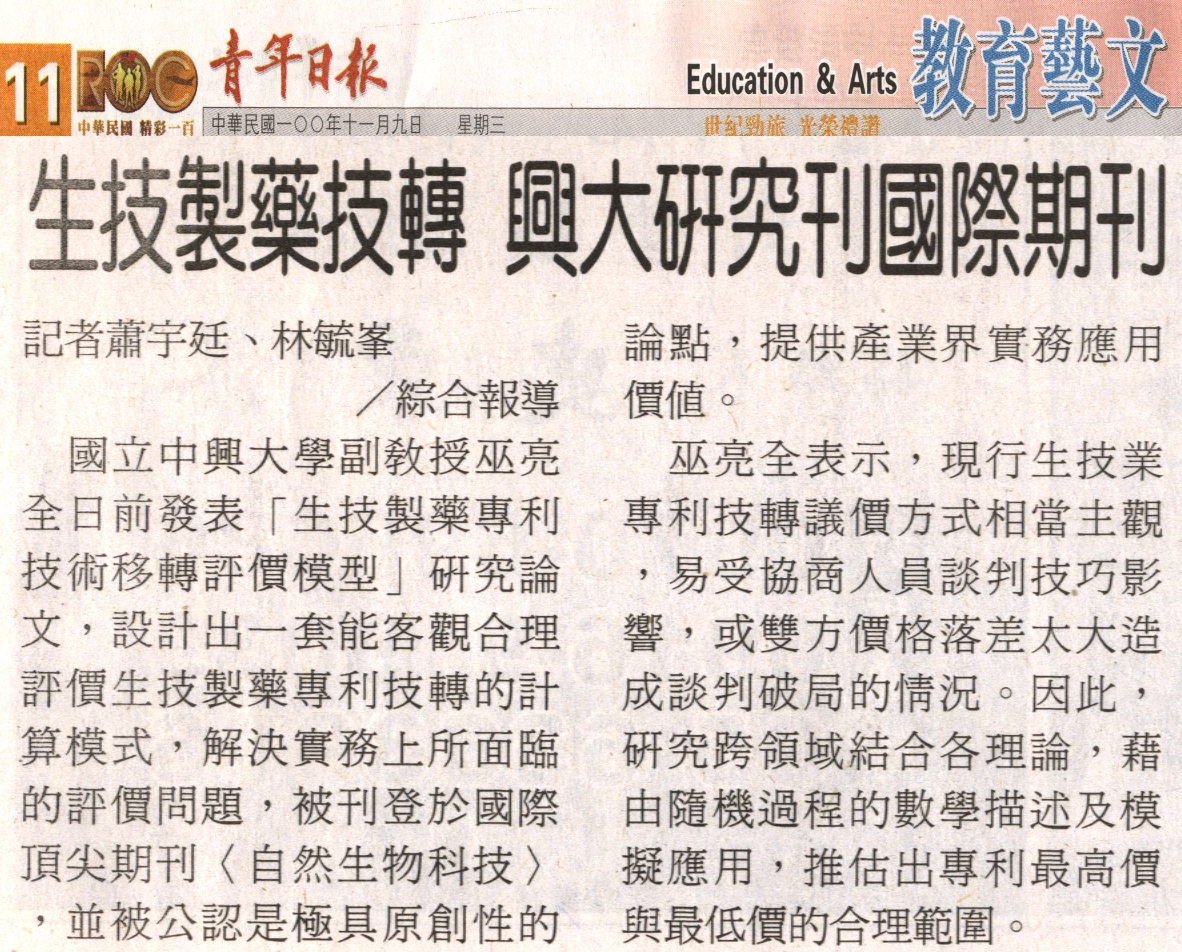 國立中興大學副教授巫亮全日前發表「生技製藥專利技術移轉評價模型」研究論文,設計出一套能客觀合理評價生技製藥專利技轉的計算模式,解決實務上所面臨的評價問題,被刊登於國際頂尖期刊〈自然生物科技〉,並被公認是極具原創性的論點,提供產業界實務應用價值。