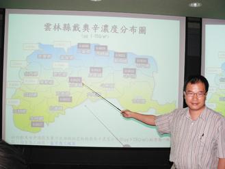 中興大學教授莊秉潔以六輕和台中港區為主要汙染源,模擬戴奧辛在雲縣20鄉鎮市的分布狀態。 記者段鴻裕/攝影 |