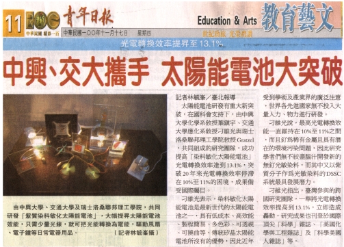 太陽能電池研發有重大新突破,在國科會支持下,由中興大學化學系教授葉鎮宇、交通大學應化系教授刁維光與瑞士洛桑聯邦理工學院教授Gratzel,共同組成的研究團隊,成功提高「染料敏化太陽能電池」光電轉換效率達到13.1%,突破20年來光電轉換效率停滯在10%至11%的困境,成果備受國際矚目。刁維光表示,染料敏化太陽能電池是最新世代的太陽能電池之一,具有低成本、高效能、製程簡易、多色彩、可透視、可撓曲等,傳統矽晶太陽能電池所沒有的優勢,因此近年受到學術及產業界的廣泛注意,世界各先進國家無不投入大量人力、物力進行研發。 刁維光說,最高光電轉換效能一直維持在10%至11%之間,而且釕為稀有金屬且具有潛在的環境污染問題,因此研究學者們無不絞盡腦汁開發新的無釕光敏染料,而其中又以紫質分子作為光敏染料的DSSC系統最具發展潛力。 刁維光指出,臺灣參與的跨國研究團隊,一舉將光電轉換效率提高到13.1%,立即造成轟動,研究成果也刊登於國際頂尖「科學」雜誌、「美國化學與工程雜誌」及「科學美國人雜誌」等。
