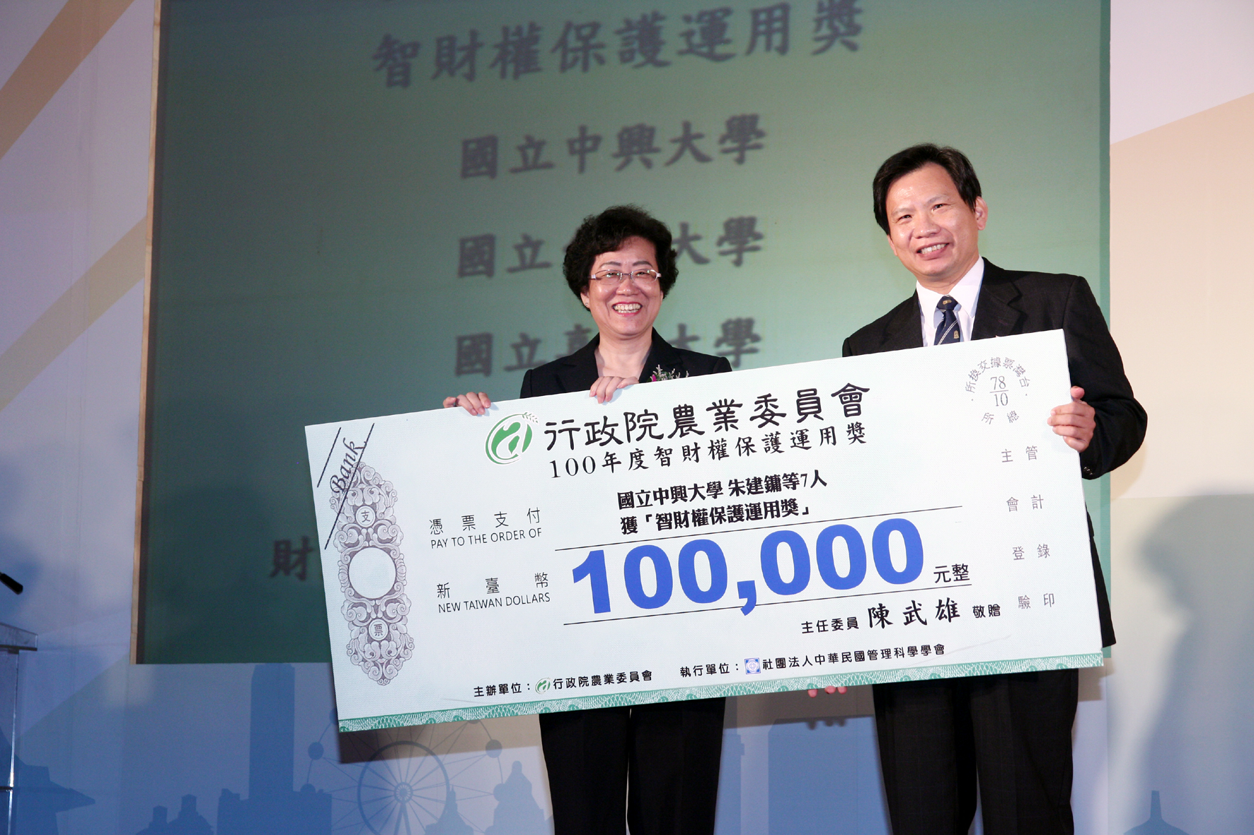 - 相關附件 中興大學產學智財營運中心主任陳政雄(右)代表領取農委會「智財權保護運用獎」獎項.jpg 、 中興大學產學智財營運中心陳政雄主任(右)代表學校授獎,洪明德經理(左)獲頒農委會「成果管理權責人員貢獻獎」.jpg