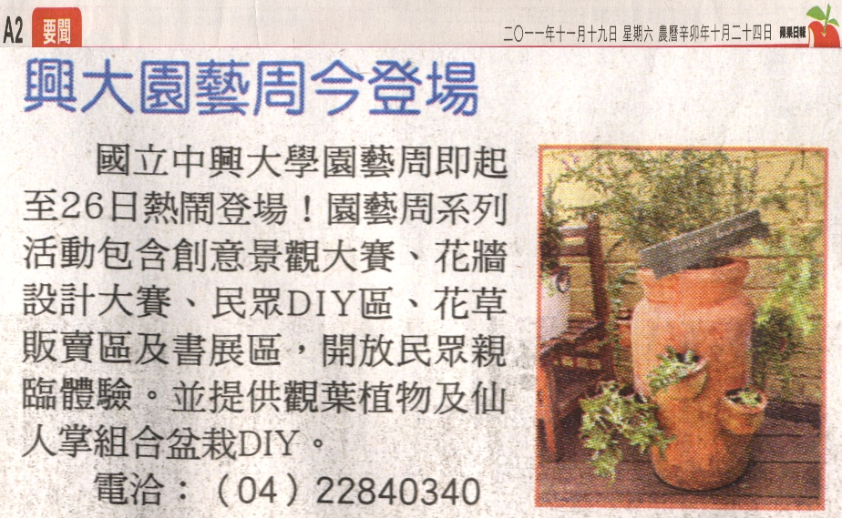 國立中興大學園藝周即起至26日熱鬧登場!園藝周系列活動包含創意景觀大賽、花牆設計大賽、民眾DIY區、花草販賣區及書展區,開放民眾親臨體驗。並提供觀葉植物及仙人掌組合盆栽DIY。 電洽:(04)22840340