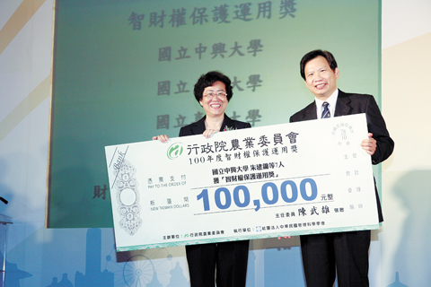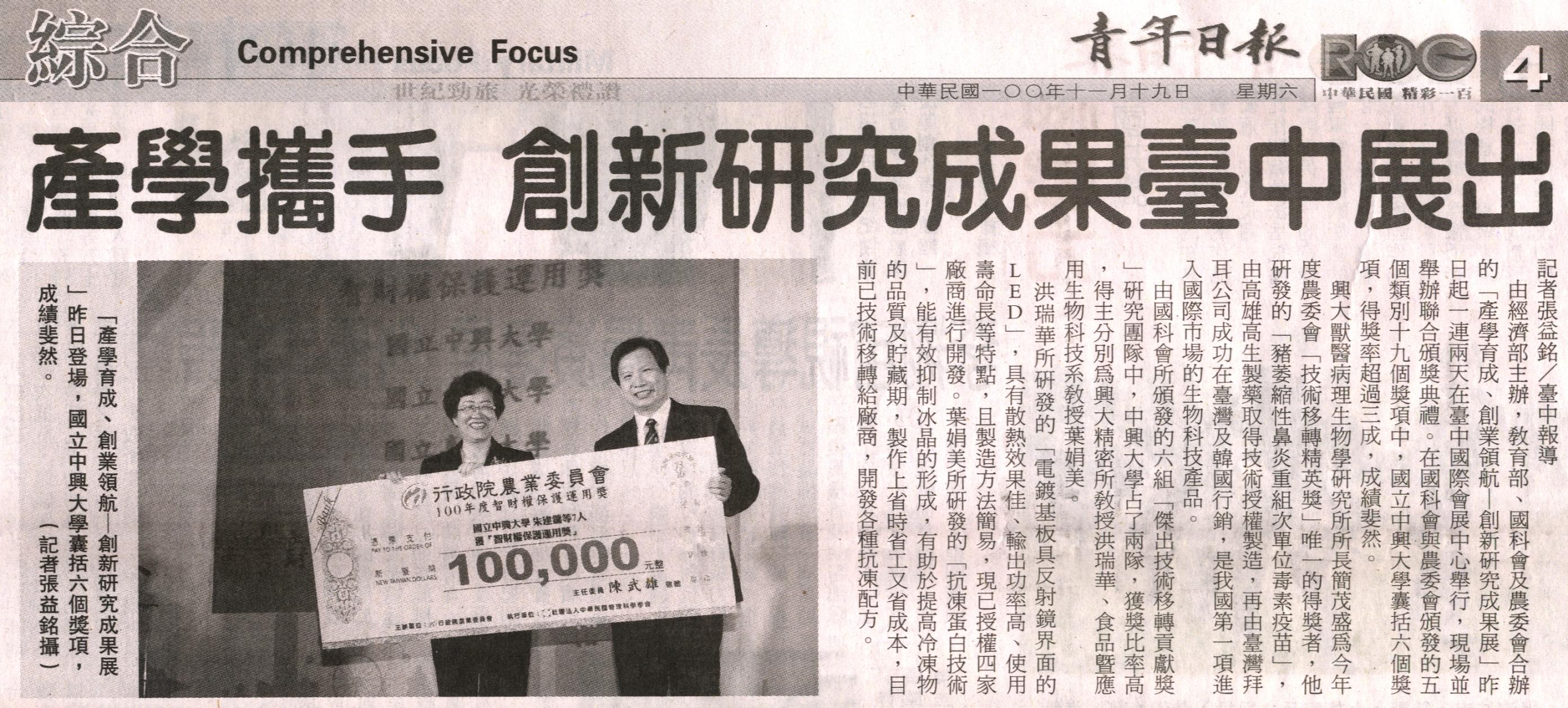 由經濟部主辦,教育部、國科會及農委會合辦的「產學育成、創業領航—創新研究成果展」昨日起一連兩天在臺中國際會展中心舉行,現場並舉辦聯合頒獎典禮。在國科會與農委會頒發的五個類別十九個獎項中,國立中興大學囊括六個獎項,得獎率超過三成,成績斐然。興大獸醫病理生物學研究所所長簡茂盛為今年度農委會「技術移轉精英獎」唯一的得獎者,他研發的「豬萎縮性鼻炎重組次單位毒素疫苗」,由高雄高生製藥取得技術授權製造,再由臺灣拜耳公司成功在臺灣及韓國行銷,是我國第一項進入國際市場的生物科技產品。 由國科會所頒發的六組「傑出技術移轉貢獻獎」研究團隊中,中興大學占了兩隊,獲獎比率高,得主分別為興大精密所教授洪瑞華、食品暨應用生物科技系教授葉娟美。 洪瑞華所研發的「電鍍基板具反射鏡界面的LED」,具有散熱效果佳、輸出功率高、使用壽命長等特點,且製造方法簡易,現已授權四家廠商進行開發。葉娟美所研發的「抗凍蛋白技術」,能有效抑制冰晶的形成,有助於提高冷凍物的品質及貯藏期,製作上省時省工又省成本,目前已技術移轉給廠商,開發各種抗凍配方。