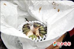 大雨一直下,鳳梨釋迦在果袋裡即發霉、裂開。 |