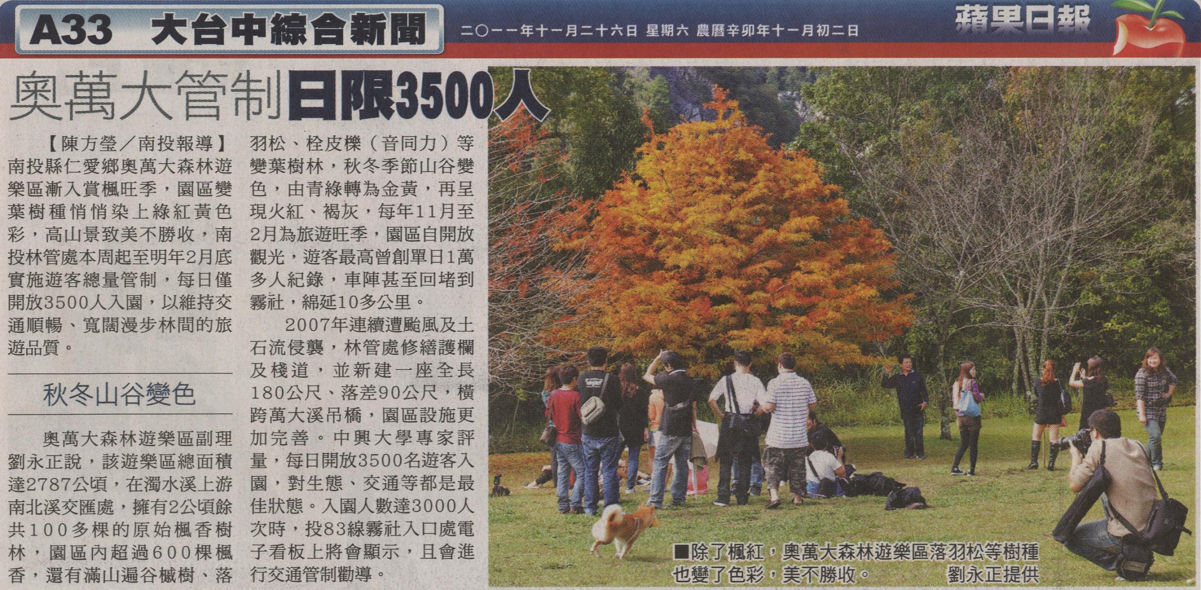 南投縣仁愛鄉奧萬大森林遊樂區漸入賞楓旺季,園區變葉樹種悄悄染上綠紅黃色彩,高山景致美不勝收,南投林管處本周起至明年2月底實施遊客總量管制,每日僅開放3500人入園,以維持交通順暢、寬闊漫步林間的旅遊品質。