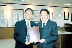 日本索尼電腦娛樂公司前榮譽會長久夛良木健(右),從中興大學校長李德財(左)手中,接下父親與叔父親筆手稿的精裝複製本。 |