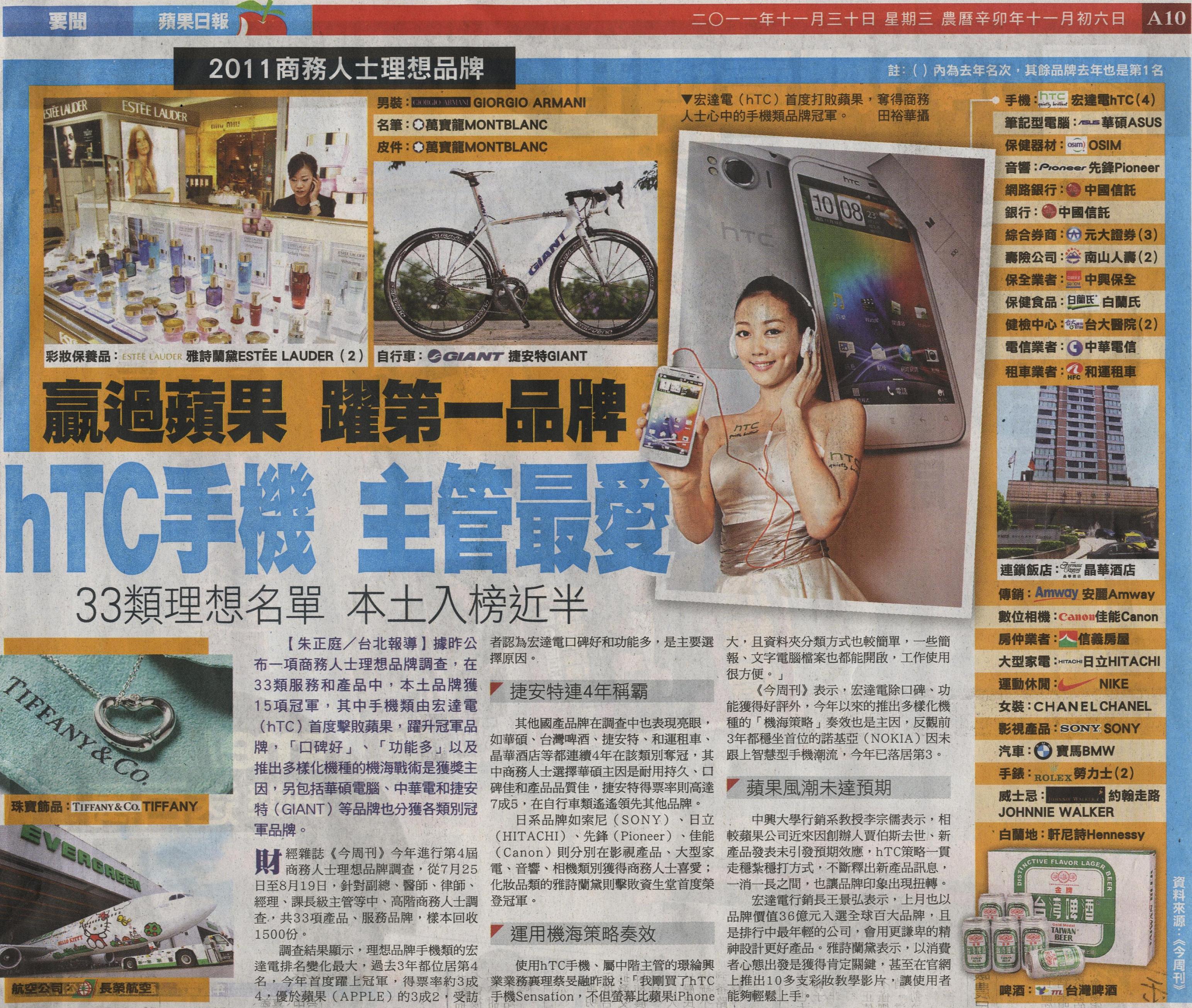 財經雜誌《今周刊》今年進行第4屆商務人士理想品牌調查,從7月25日至8月19日,針對副總、醫師、律師、經理、課長級主管等中、高階商務人士調查,共33項產品、服務品牌,樣本回收1500份。