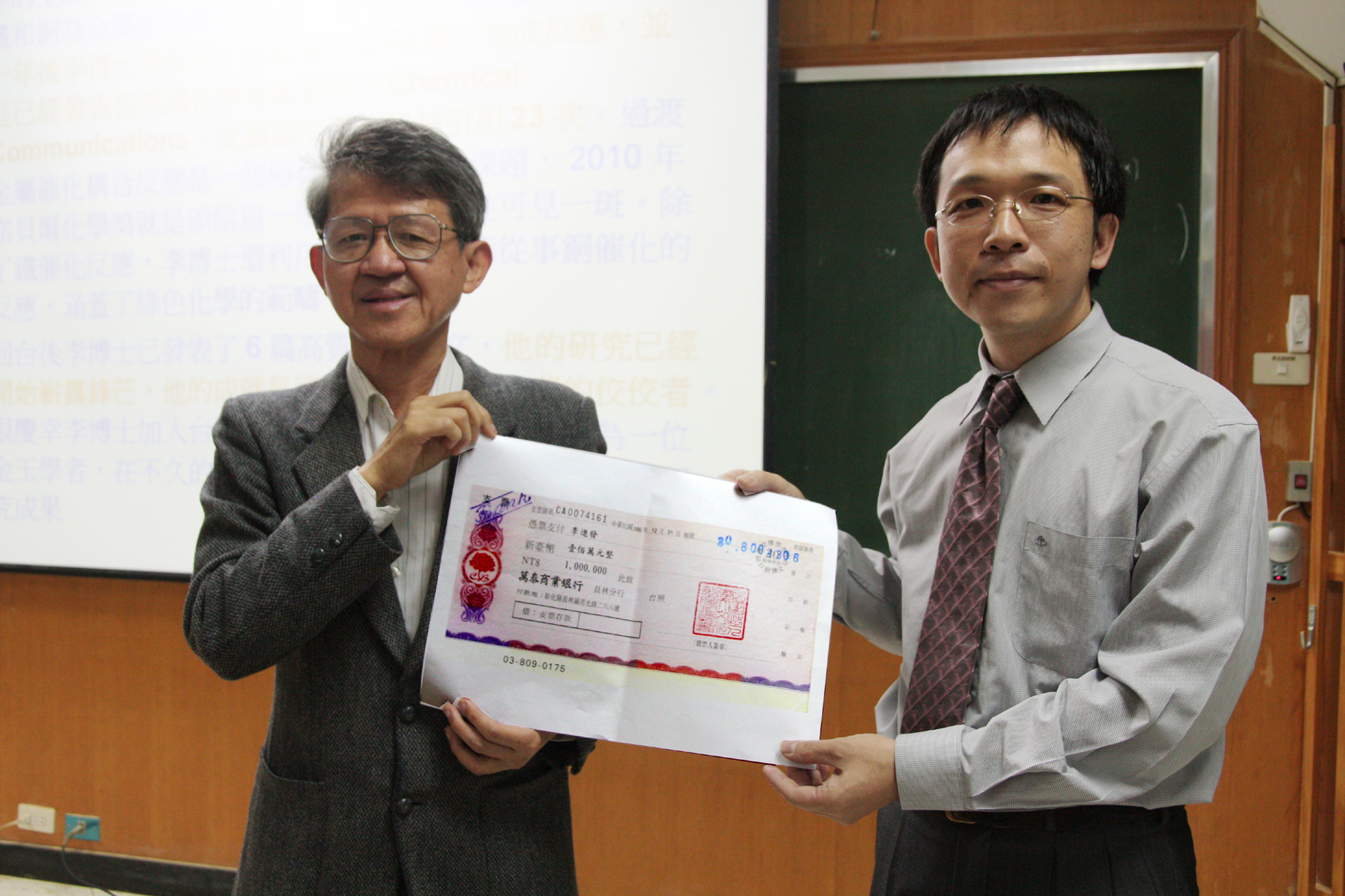 建大基金會董事楊信男教授(左)親頒百萬支票給興大化學系李進發副教授(右) |