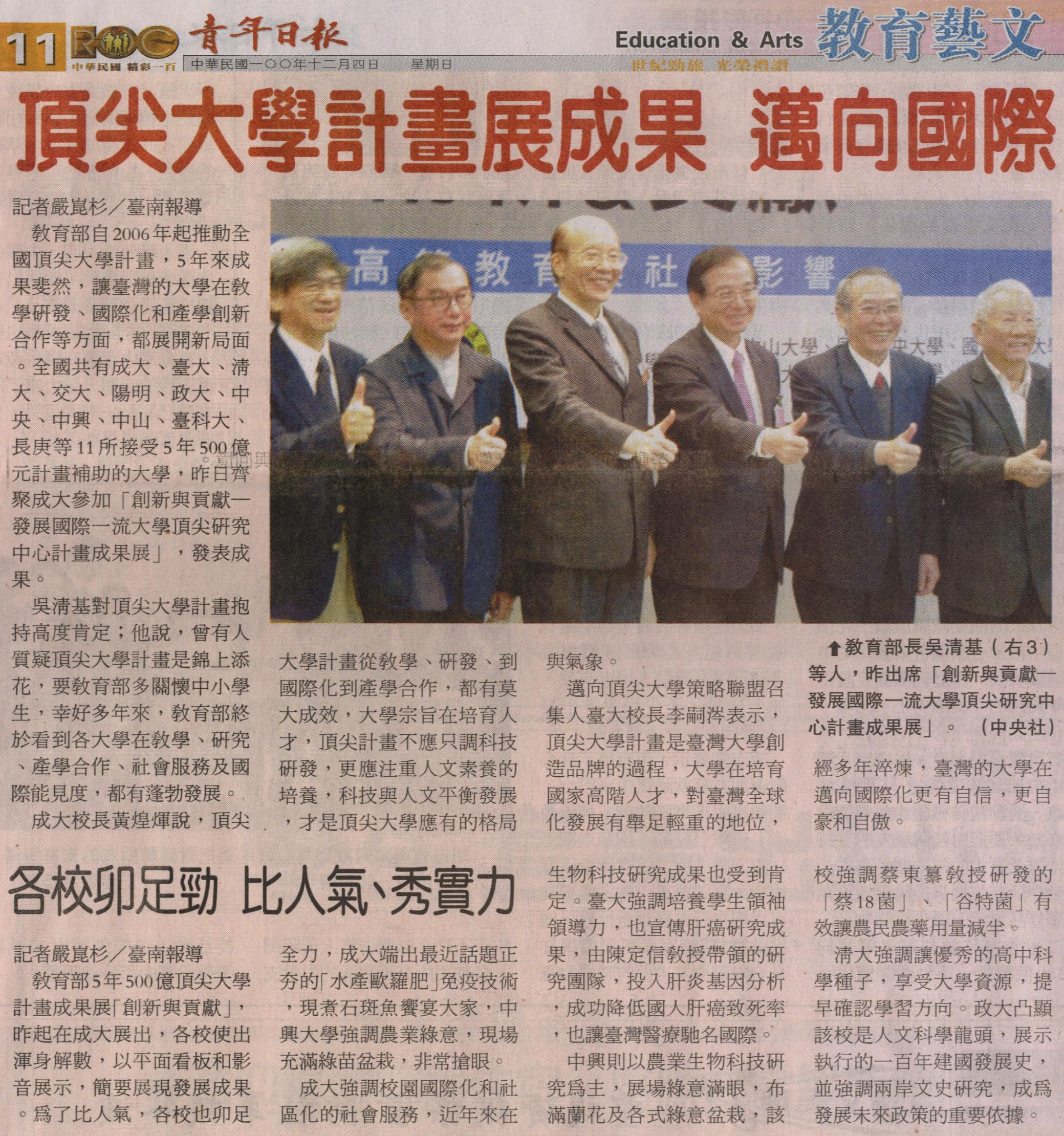 教育部5年500億頂尖大學計畫成果展「創新與貢獻」,昨起在成大展出,各校使出渾身解數,以平面看板和影音展示,簡要展現發展成果。為了比人氣,各校也卯足全力,成大端出最近話題正夯的「水產歐羅肥」免疫技術,現煮石斑魚饗宴大家,中興大學強調農業綠意,現場充滿綠苗盆栽,非常搶眼。成大強調校園國際化和社區化的社會服務,近年來在生物科技研究成果也受到肯定。臺大強調培養學生領袖領導力,也宣傳肝癌研究成果,由陳定信教授帶領的研究團隊,投入肝炎基因分析,成功降低國人肝癌致死率,也讓臺灣醫療馳名國際。